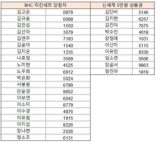추첨을 통해 아래의 당첨자들에게는 각각 BHC 치킨세트, 신세계 5만원 상품권이 발송됩니다.