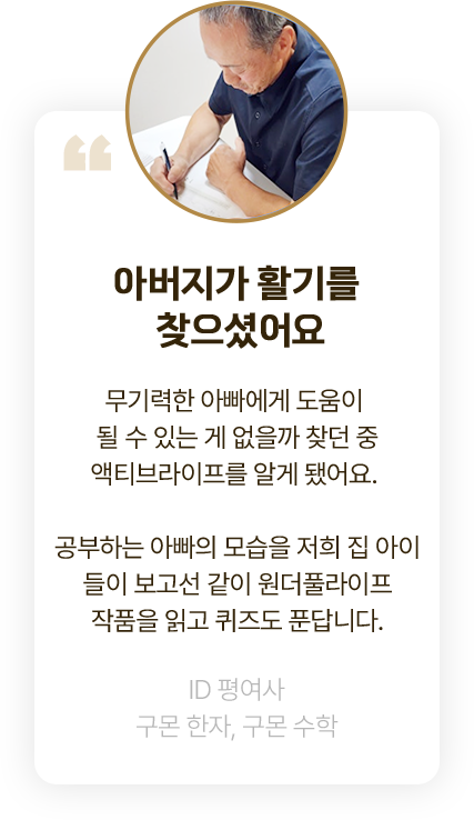 기억력이 예전 같지 않다고 느낀다면, 새로운 걸 배우고 싶은데 시작이 막막하다면, 노후를 건강하고 활기차게 보내고 싶다면 구몬 액티브라이프.