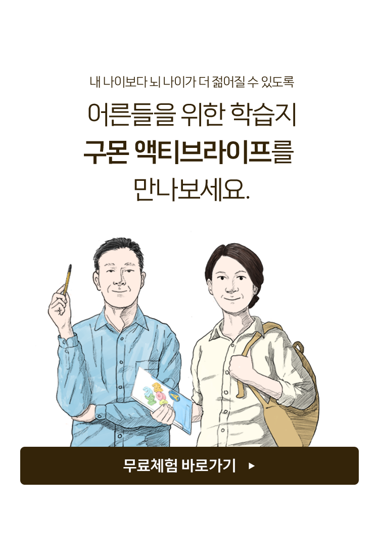 등산도 좋고, 운동도 좋지만 뇌를 위한 일상 루틴도 필요합니다. 하루 30분, 나를 위한 배움. 더 젋게 사는 습관 '구몬 액티브라이프'를 만나보세요!